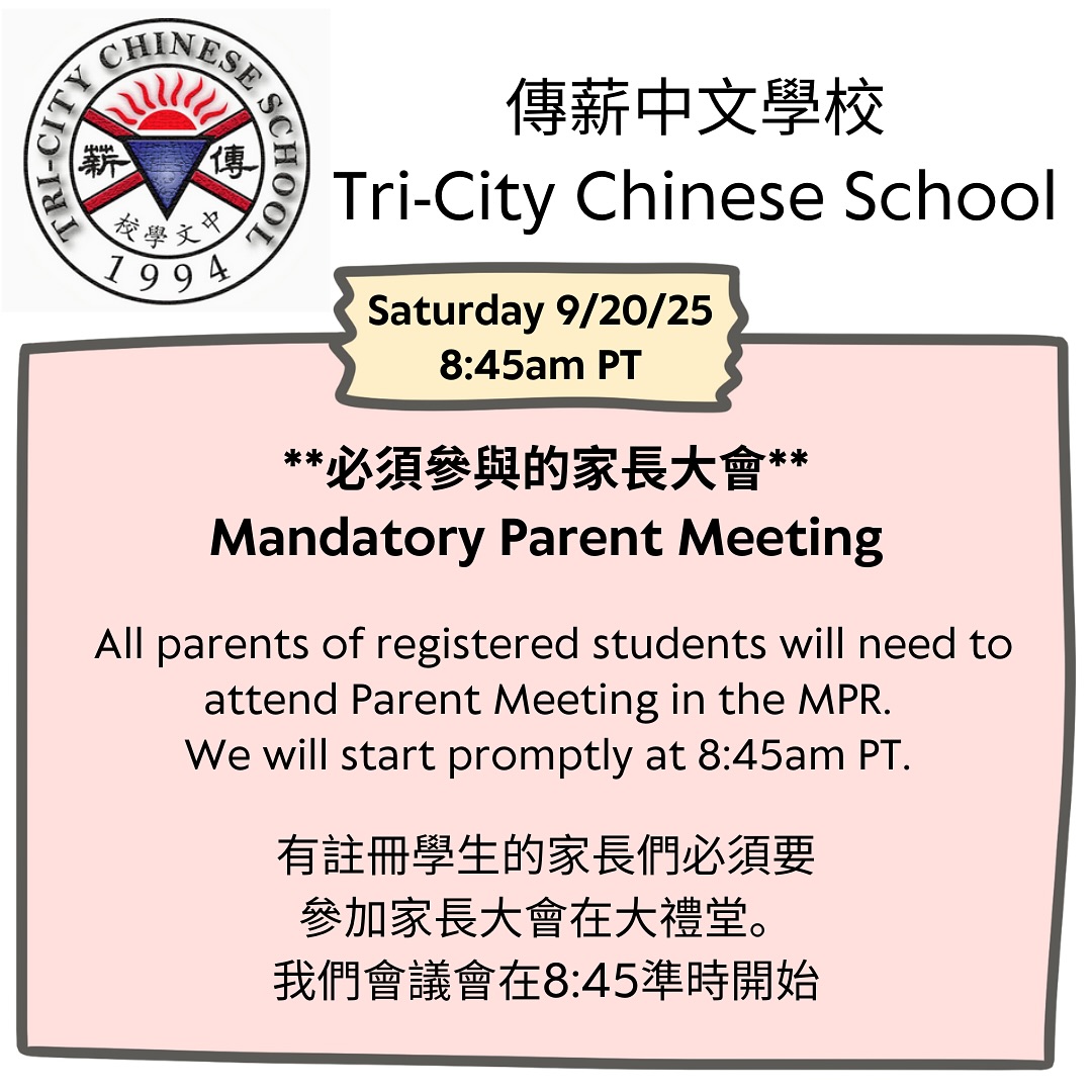 星期六9/20/25傳薪中文學校會舉辦必須參與的家長大會。有註冊學生的家長們必須要參加家長大會在大禮堂。我們會議會在8:45準時開始。 September 15, 2025 at 07:55PM