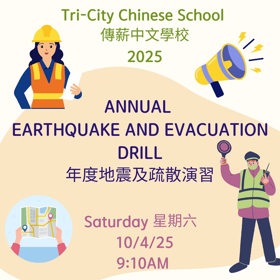 Our school will be conducting the annual Earthquake and Evacuation (Fire) Drill at 9:10AM on Saturday 10/4/25. Please let your child(ren) know of the planned Drill so they know what to expect on that day. Students and TAs should arrive on time to allow for the teachers to mark the attendance roll. If your child will be absent on the day, please let your teacher and/or class rep know ahead of time. For those parent(s) who have signed up for security duty this Saturday, please refer to a specific email for your additional roles.
