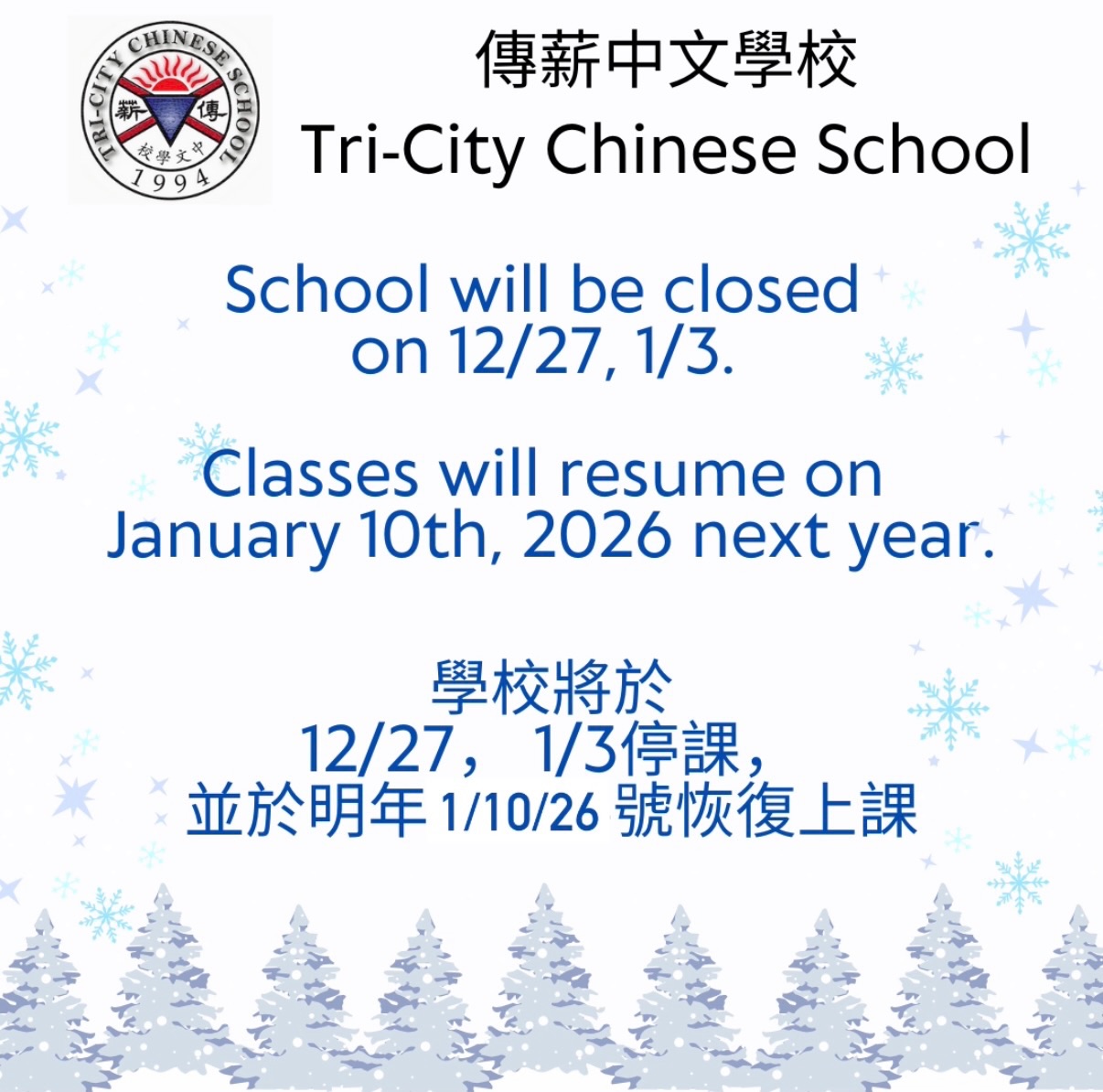 Dear Tri-City Chinese School Teachers, Parents, Students and Staff: the Chinese School will be closed on 12/27, 1/3 and then will resume on 1/10/26 next year.
