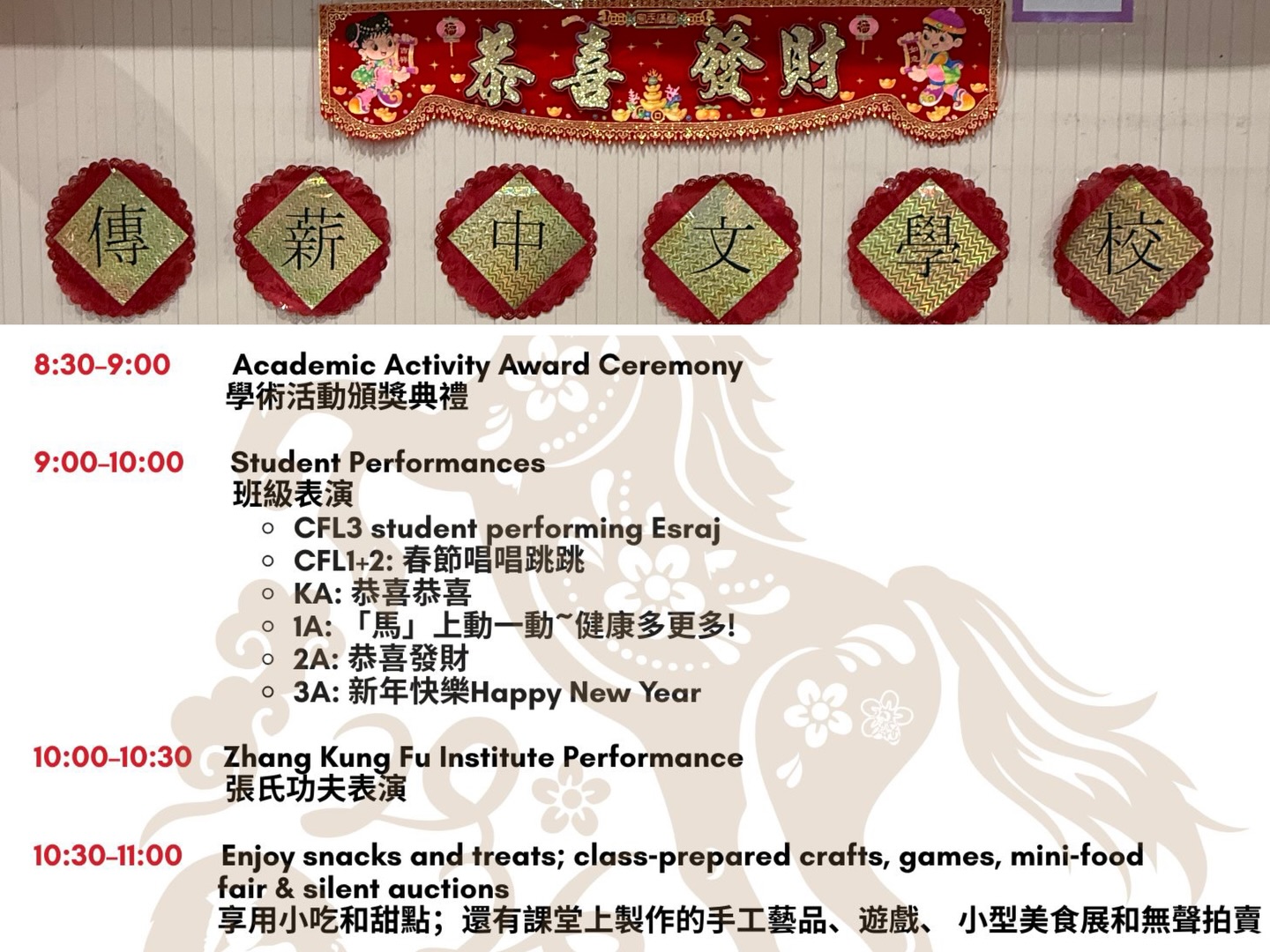 The New Year Celebration is this Saturday 2/7! Here is the Schedule for the New Year Event:* 8:30–9:00 Academic Competition Awards Ceremony