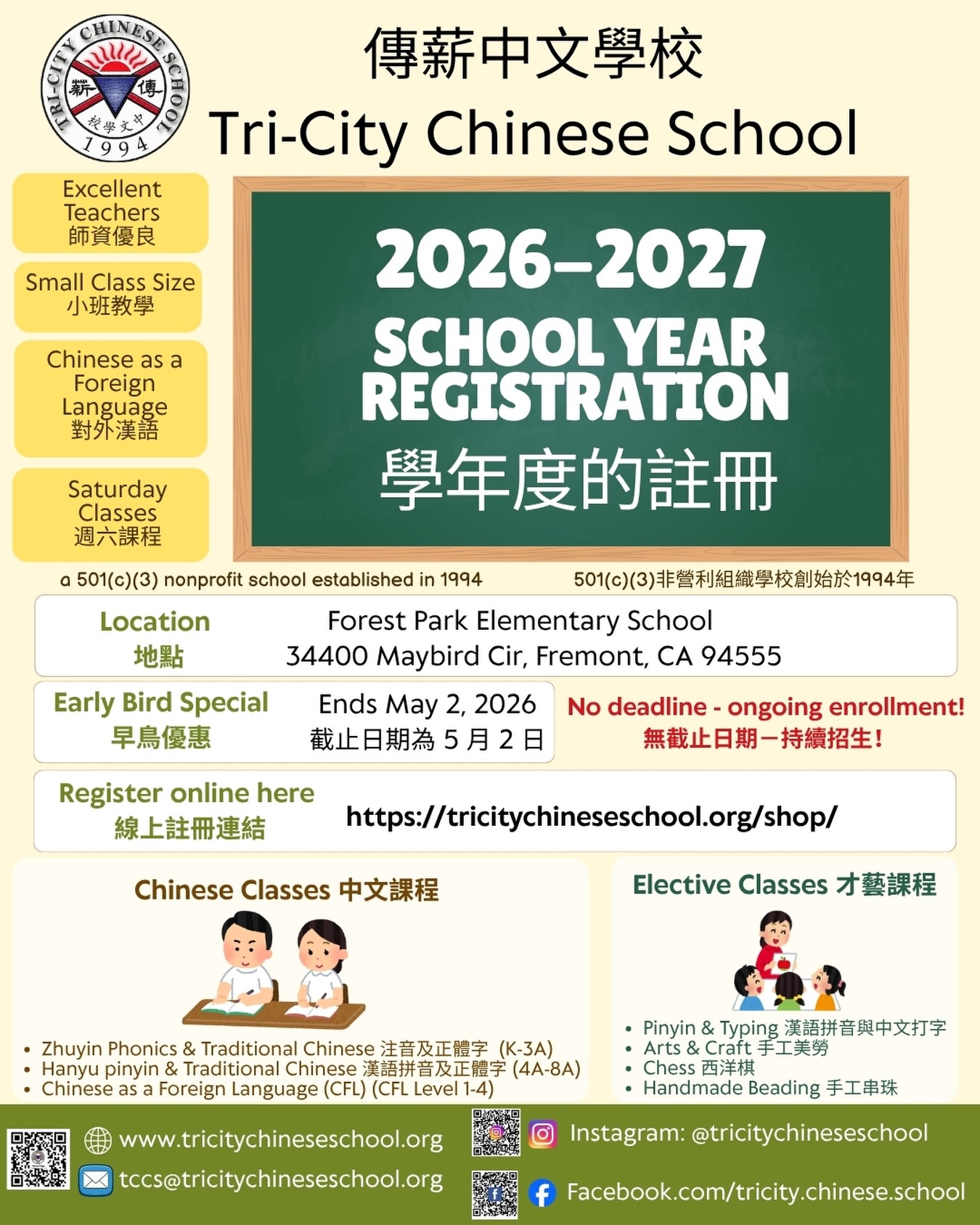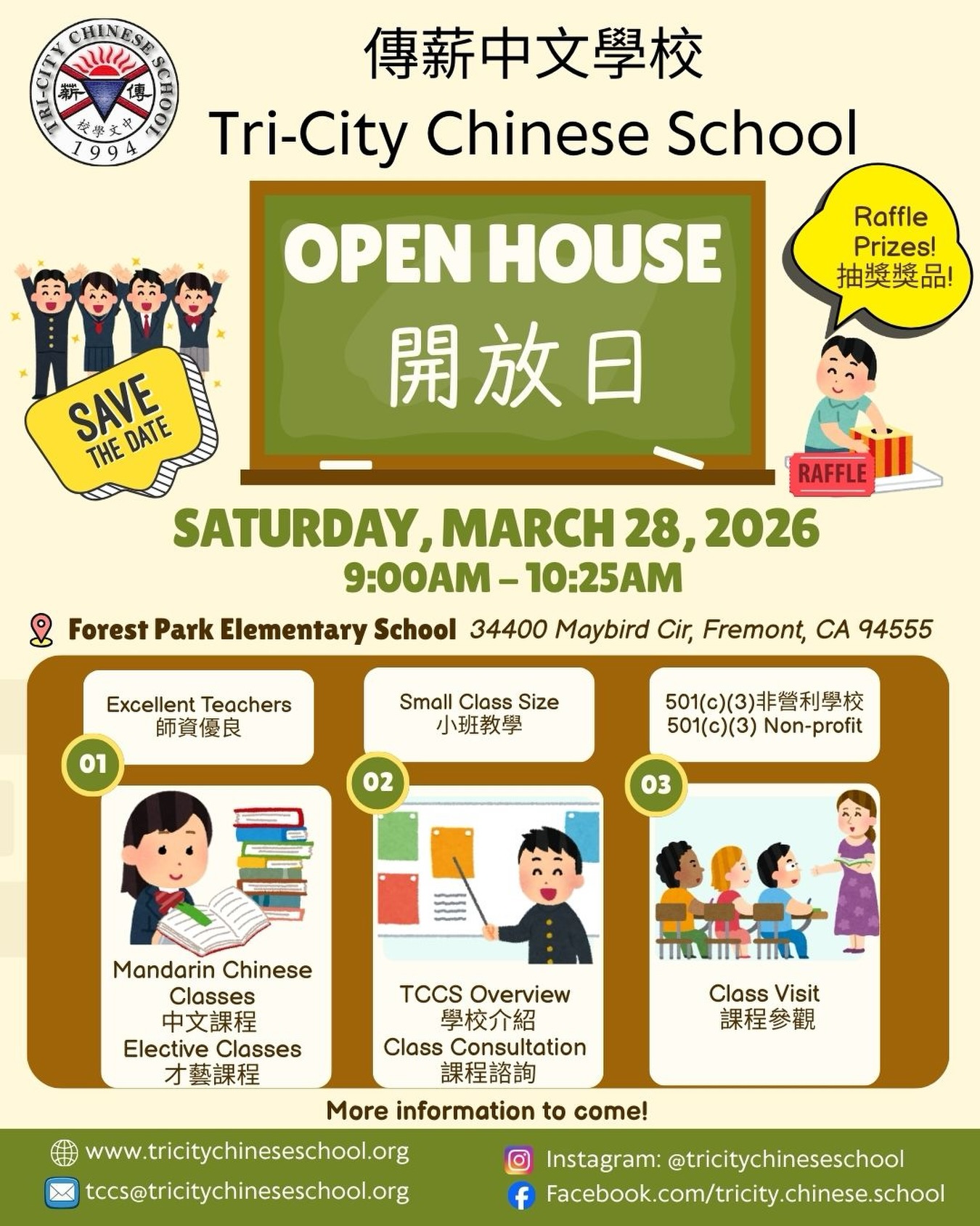 🏫Tri-City Chinese School Open House on Saturday 3/28/26, 9:00am – 10:25am! Come learn about the different Chinese classes we offer, along with elective classes!