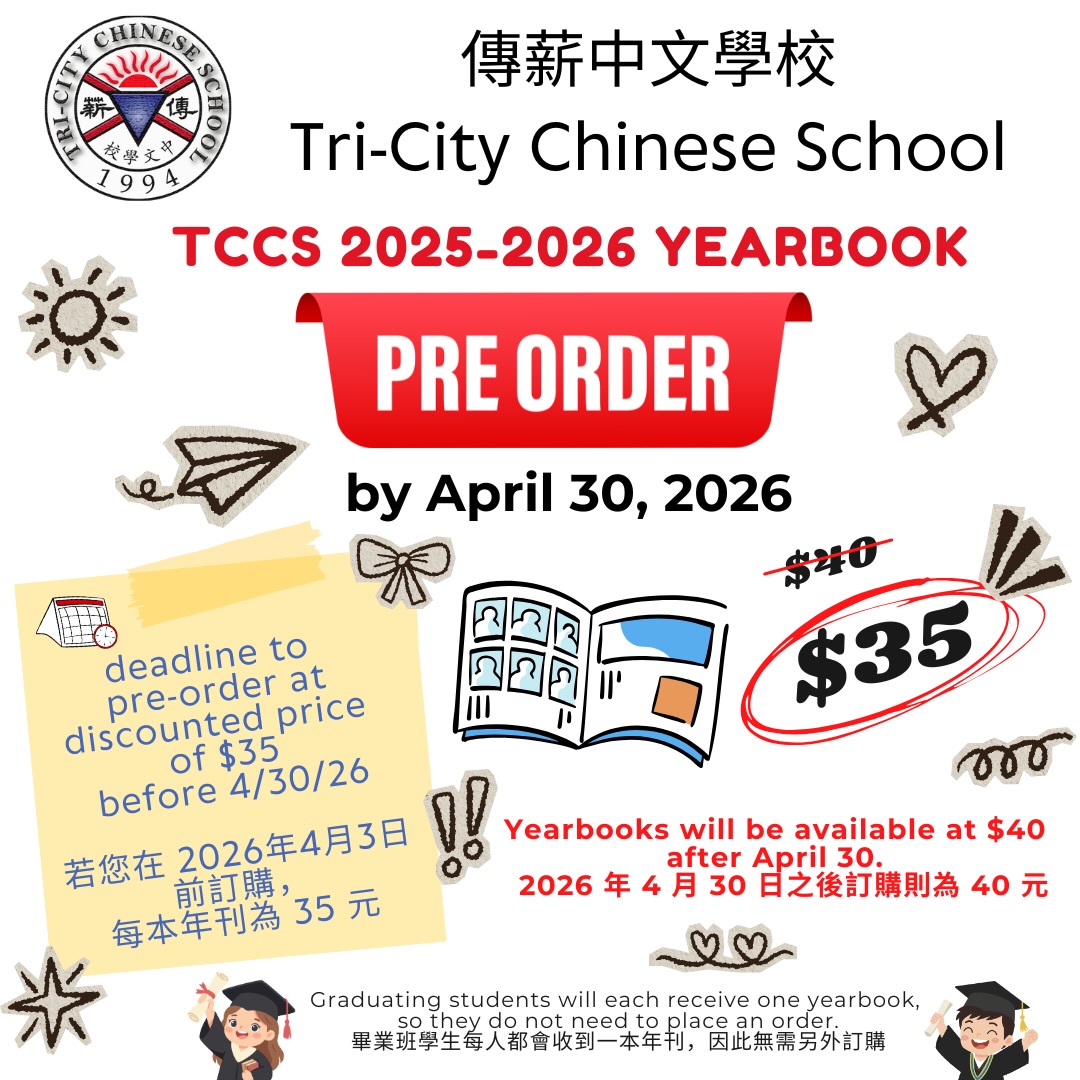 Please order by filling the order form: https://forms.gle/W17tN68A21jp7UwKA or stop by office Room502 during school hours. Payment can be by either cash or school Zelle ( accountant (@) tricitychineseschool.org ). If you made payment via Zelle, please make a note of your student’s class and name for recording purpose.